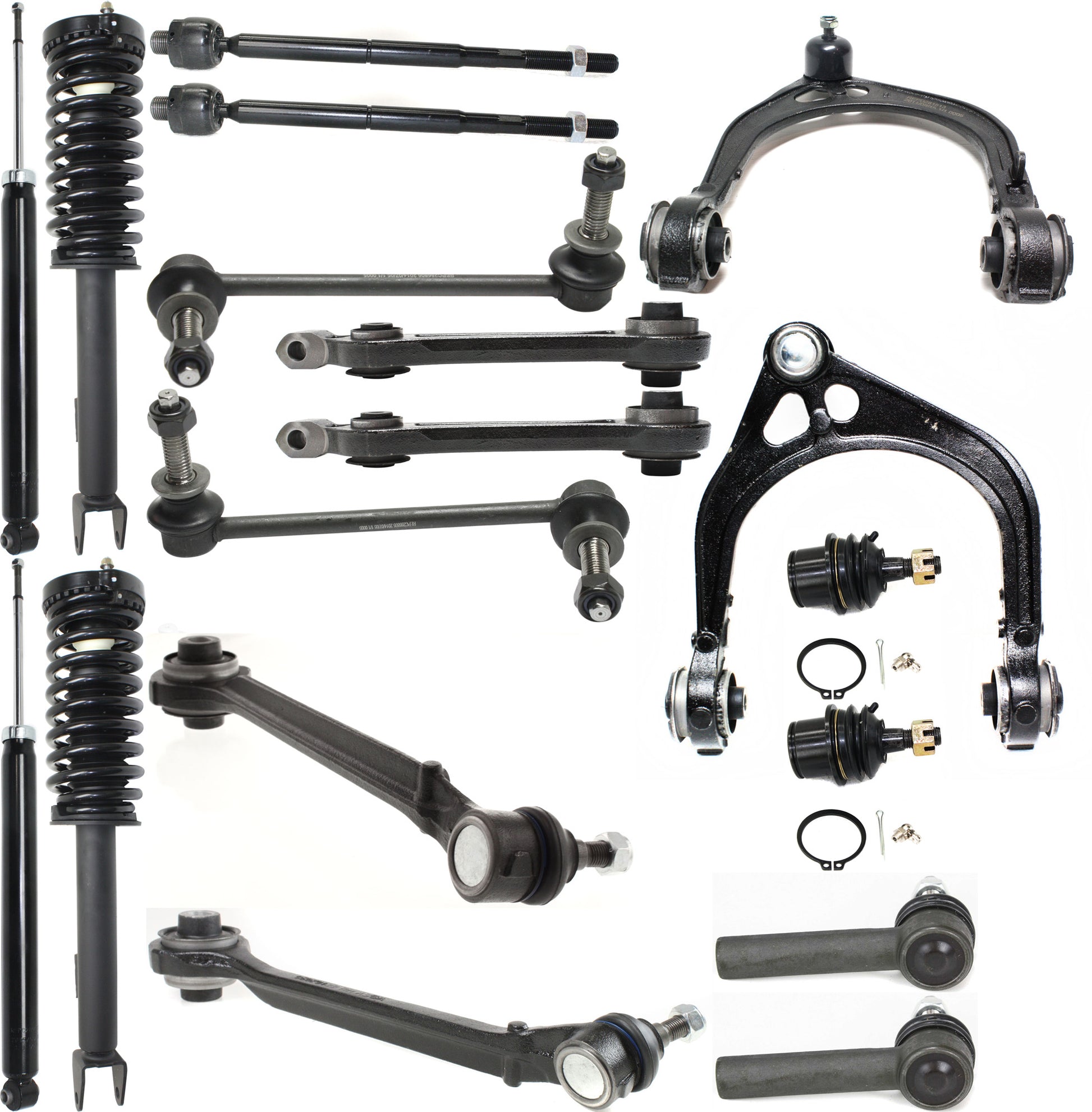 18-Piece Kit Front Control Arm Kit Includes (6) Control Arm, (2) Sway Bar Link, (2) Ball Joint, (4) Tie Rod End and (4) Shock Absorber and Strut Assembly