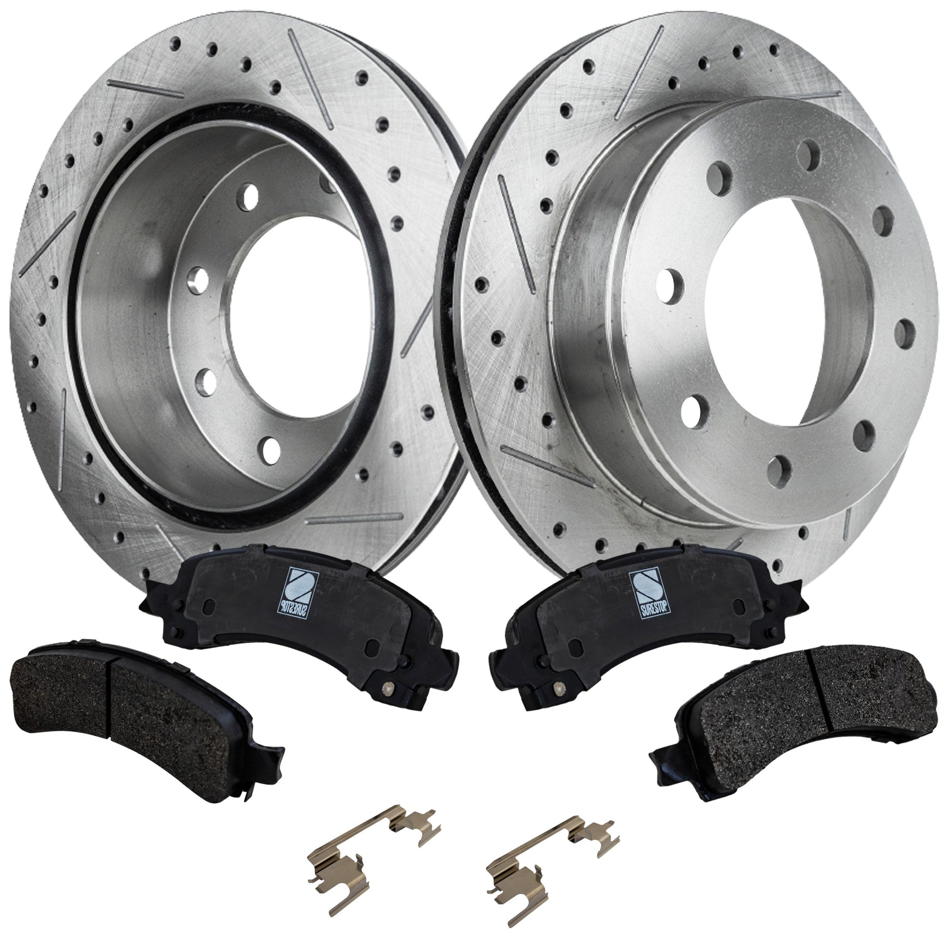 2-Wheel Set Rear Brake Disc and Pad Kit, Cross-drilled and Slotted 8 Lugs 329.95 mm Ceramic Pro-Line Series, Includes (1) Brake Pad Set and (2) Brake Disc