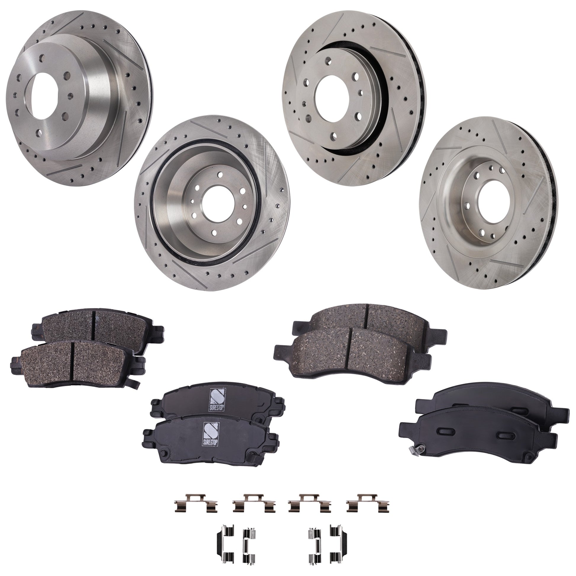 4-Wheel Set Front and Rear Brake Disc and Pad Kit, Cross-drilled and Slotted 6 Lugs Front-301.8 mm/Rear-325.12 mm Front-Ceramic/Rear-Semi-Metallic Pro-Line Series, Includes (2) Pad Set and (4) Disc