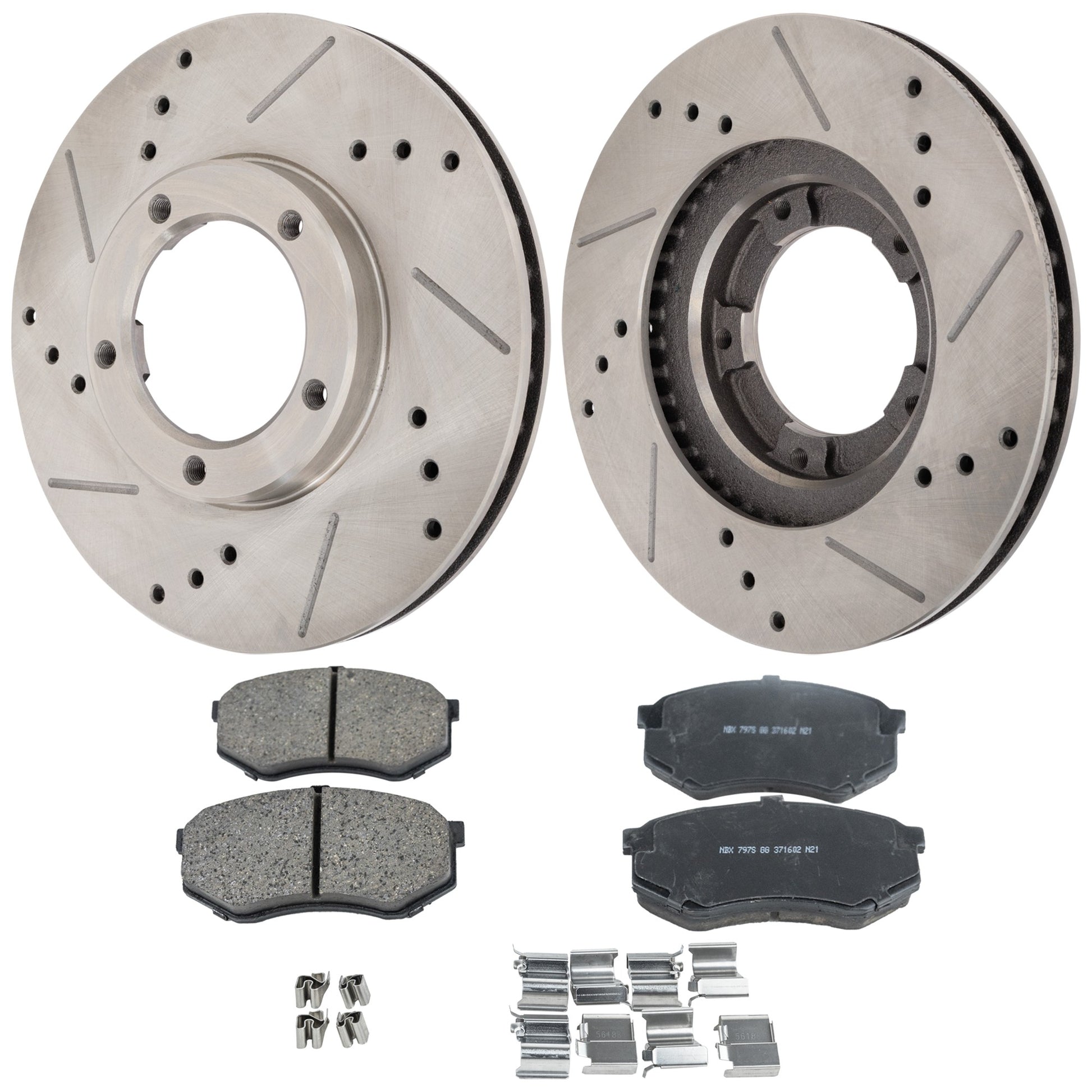 2-Wheel Set Front Brake Disc and Pad Kit, Cross-drilled and Slotted 5 Lugs 253.75 mm Ceramic Pro-Line Series, Includes (1) Brake Pad Set and (2) Brake Disc