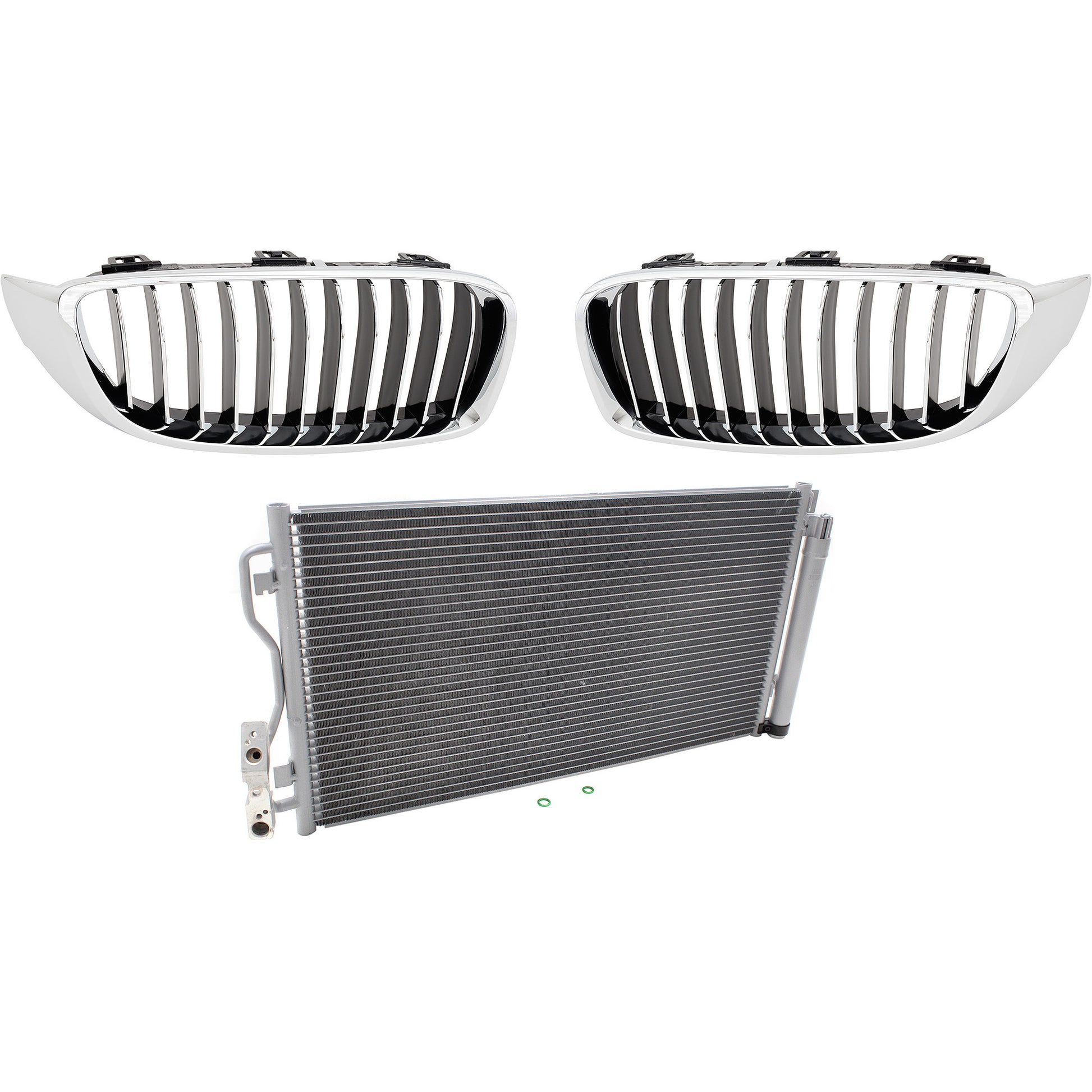3-Piece Kit Base Driver and Passenger Side Grille Chrome Shell w/ Textured Black Insert, Includes (1) A/C Condenser and (2) Grille Assembly