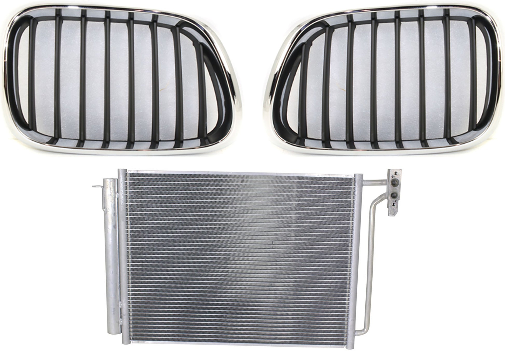 3-Piece Kit Driver and Passenger Side Grille Chrome Shell with Black Insert, Includes (1) A/C Condenser and (2) Grille Assembly