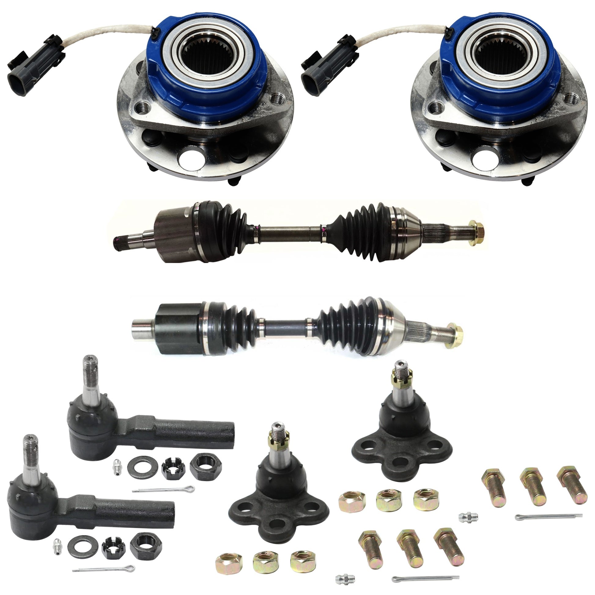 8-Piece Kit Front, Driver and Passenger Side Axle Assembly, includes (2) Axle Assembly, (2) Ball Joint, (2) Tie Rod End, and (2) Wheel Hub