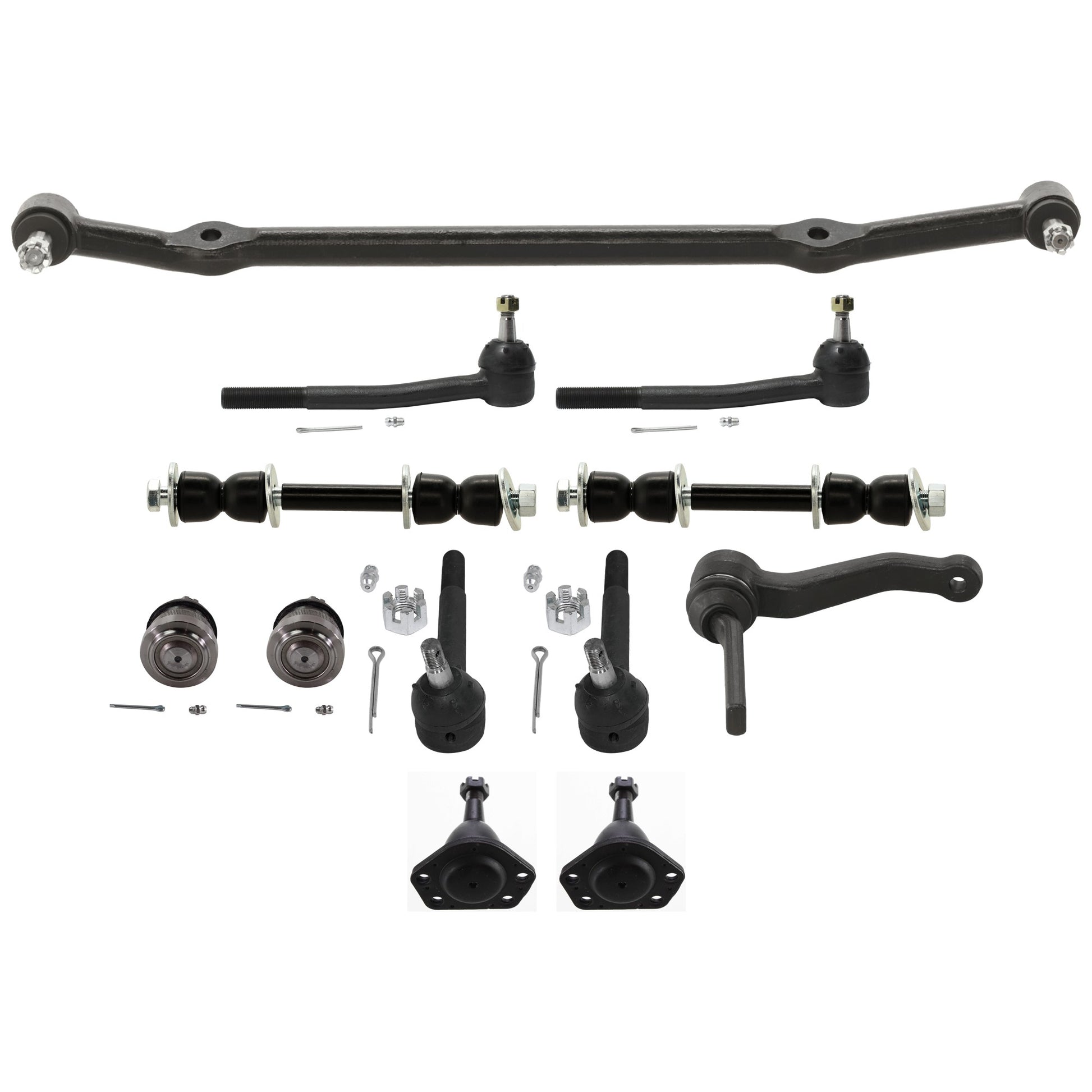 12-Piece Kit Center Link, includes (1) Center Link, (1) Sway Bar Link, (2) Ball Joint, (2) Ball Joint and (2) Tie Rod End