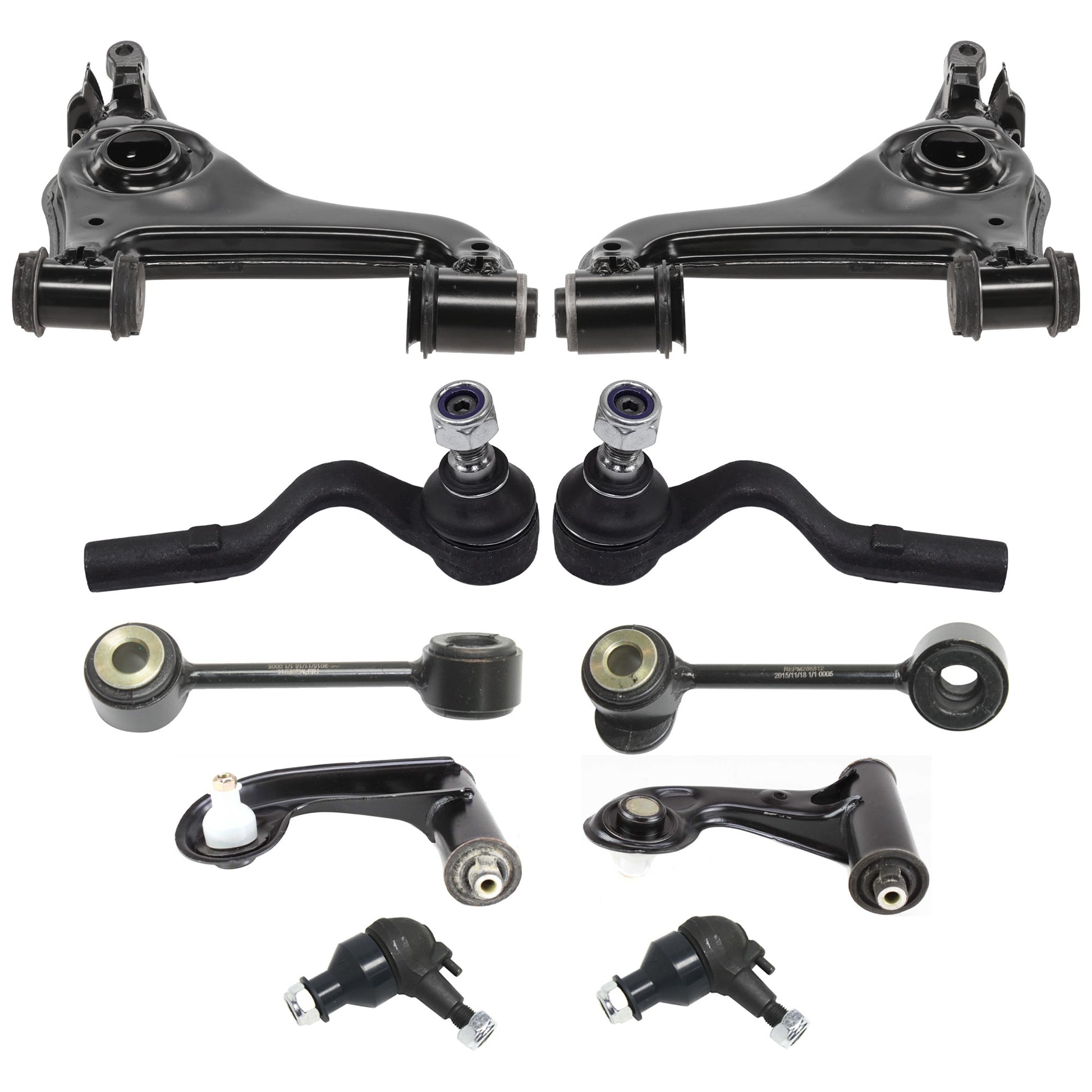 10-Piece Kit Front, Driver and Passenger Side, Upper and Lower, Outer Control Arm, includes (2) Ball Joint, (4) Control Arm, (2) Sway Bar Link, and (2) Tie Rod End