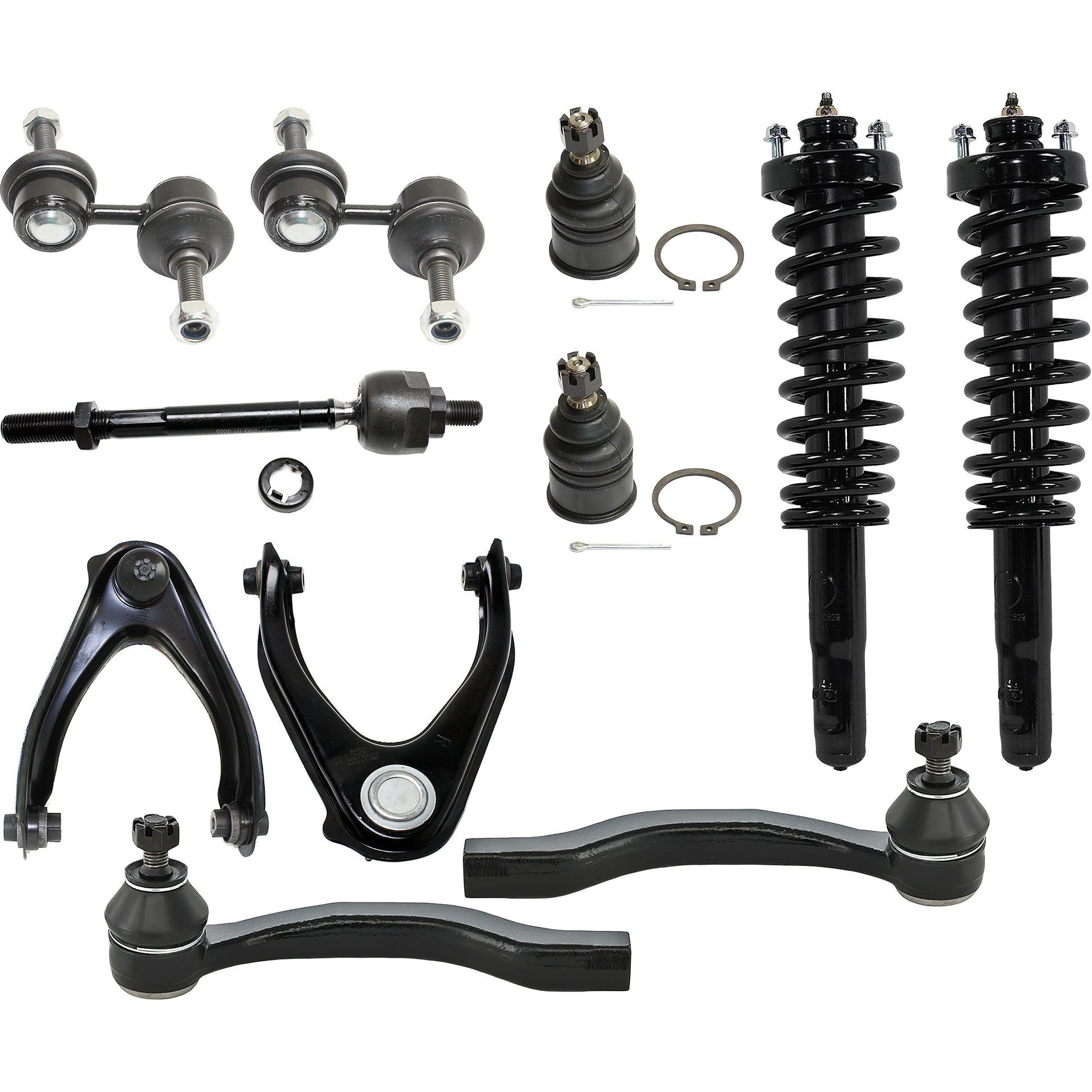 12-Piece Kit Front, Driver and Passenger Side, Upper Control Arm Kit, Includes (2) Ball Joint, (2) Control Arm, (2) Loaded Strut, (2) Sway Bar Link, and (4) Tie Rod End