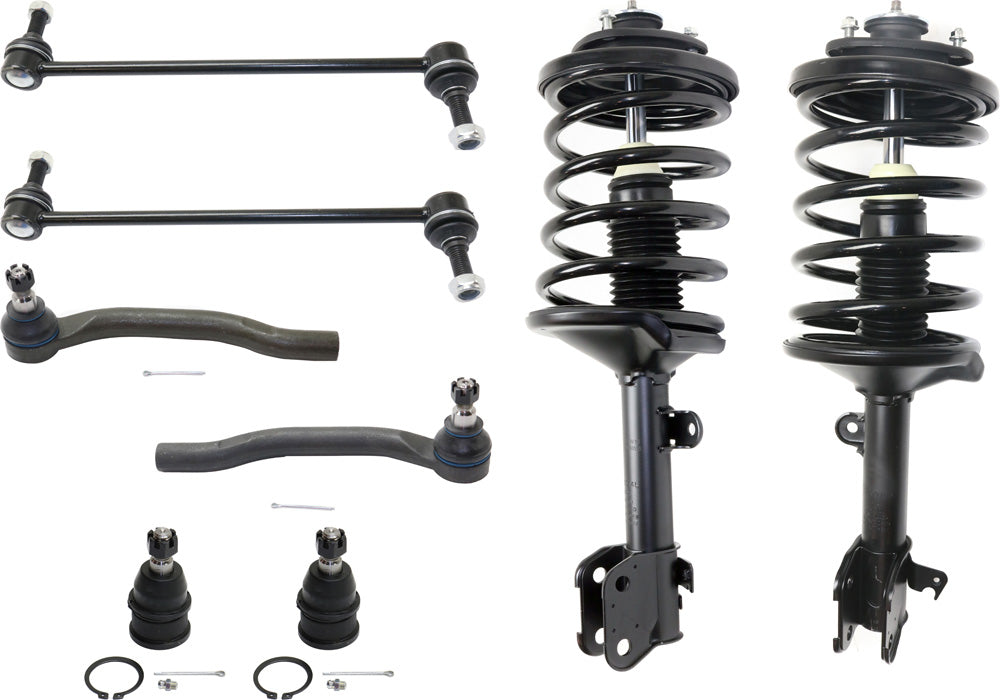 Комплект из 8 деталей для передней подвески со стороны водителя и пассажира, включает в себя (2) шаровых шарнира, (2) наконечника рулевой тяги, (2) тяги стабилизатора поперечной устойчивости и (2) амортизатора и стойки в сборе