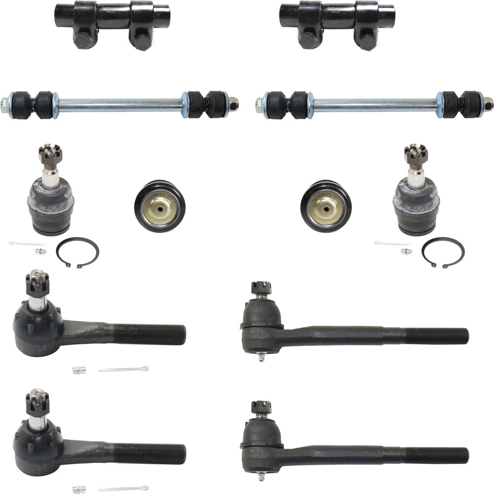 Комплект передней подвески из 12 деталей, включает в себя (4) шаровых шарнира, (4) наконечника рулевой тяги, (2) тяги стабилизатора поперечной устойчивости и (2) регулировочные втулки рулевой тяги