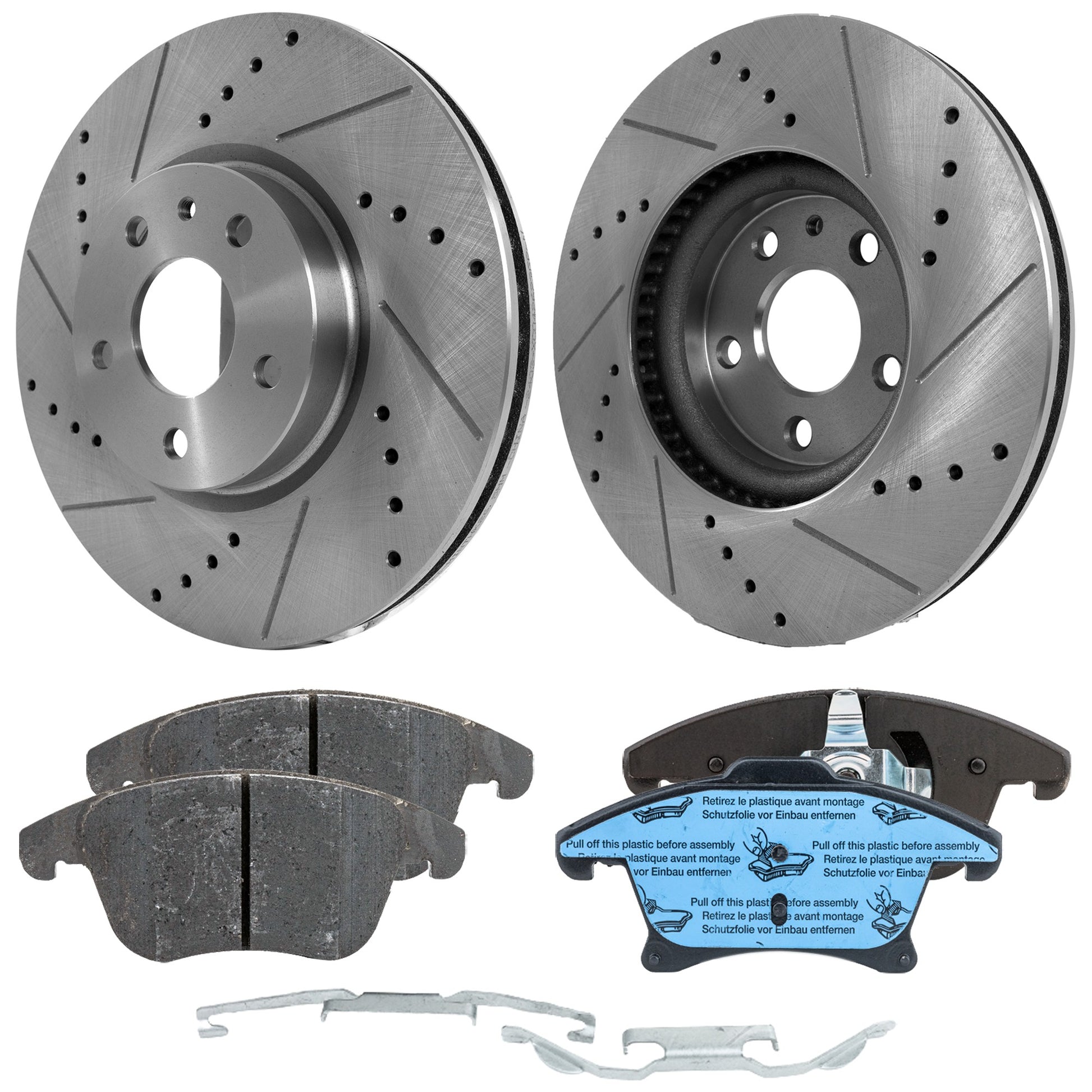 Комплект из 2 передних тормозных дисков и колодок, перфорированные и насеченные, керамические, серии Pro-Line диаметром 300 мм, включает в себя (2) тормозных диска и (1) комплект тормозных колодок