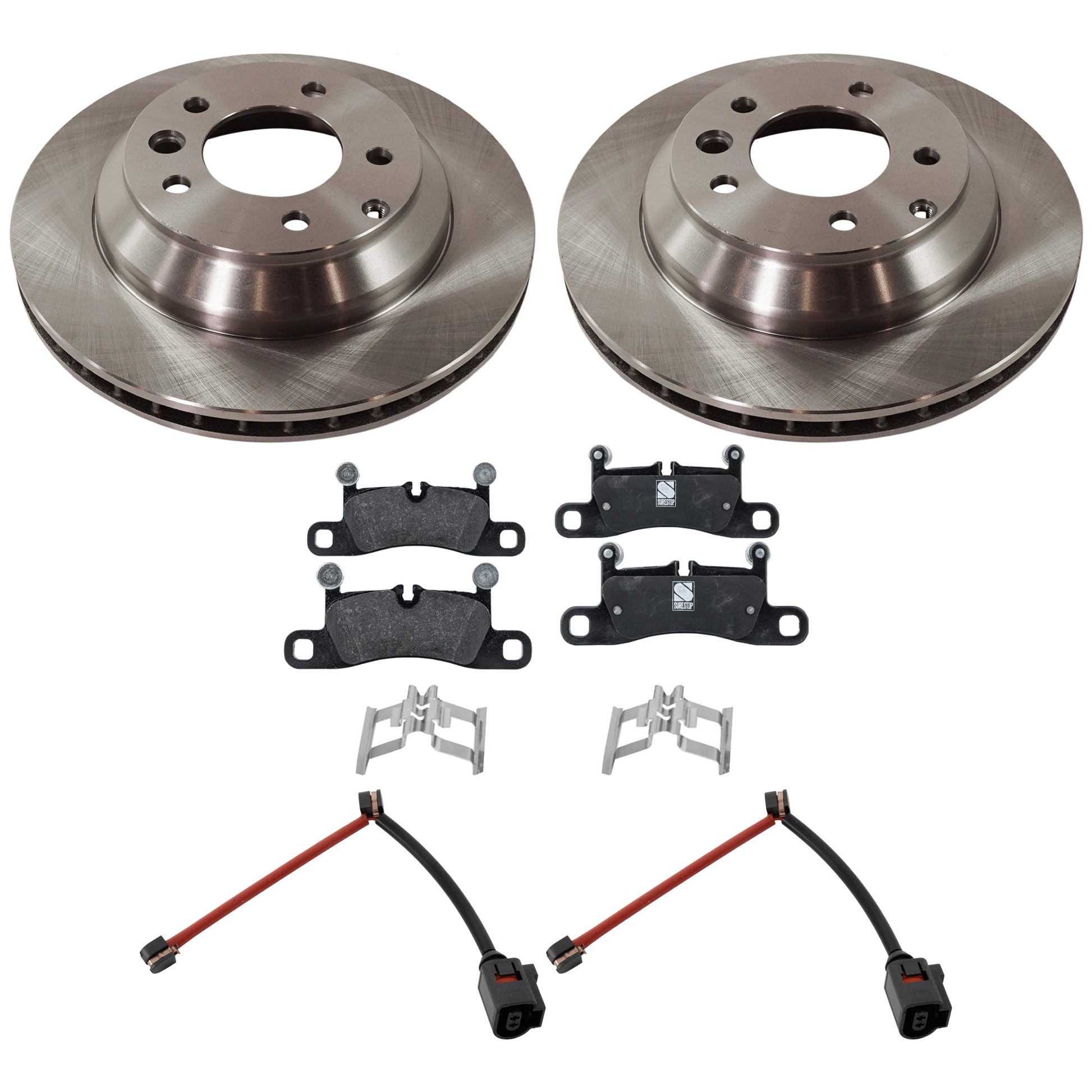 Комплект из 2 задних тормозных дисков и колодок, гладкая поверхность, 5 болтов, 329,95 мм, органический, включает в себя (1) комплект тормозных колодок, (2) датчика тормозных колодок и (2) тормозных диска
