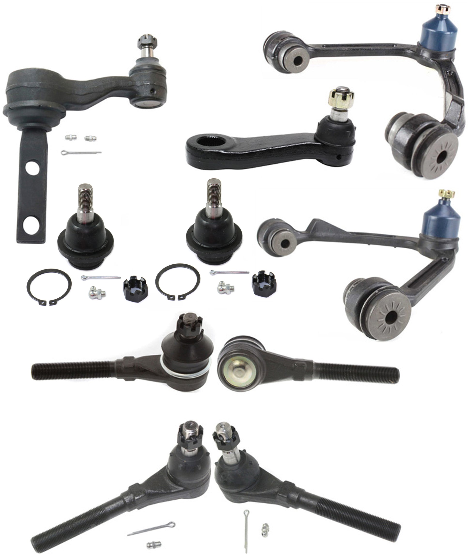 Комплект из 10 предметов: передний, со стороны водителя и пассажира, комплект верхних рычагов подвески, включает в себя (2) шаровых шарнира, (2) рычага подвески, (1) маятниковый рычаг, (1) сошку и (4) наконечника рулевой тяги
