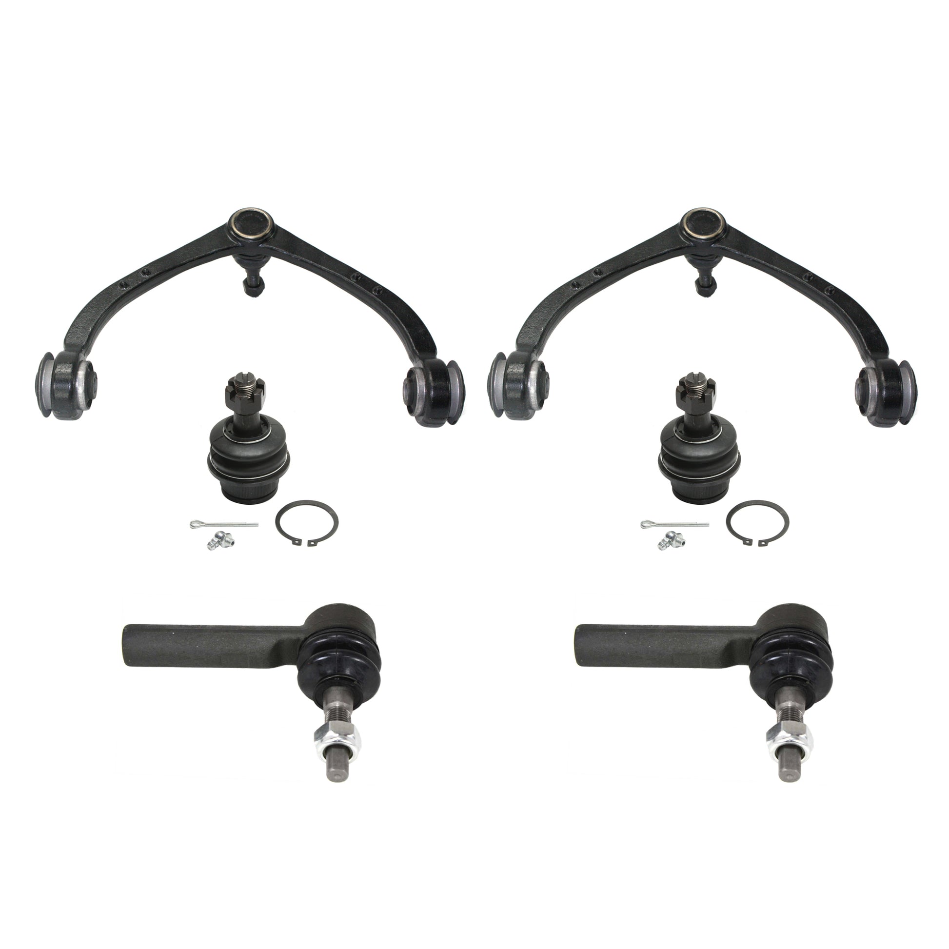 Комплект из 6 предметов: передний, со стороны водителя и пассажира, комплект верхних рычагов подвески, включает (2) шаровых шарнира, (2) рычага подвески и (2) наконечника рулевой тяги