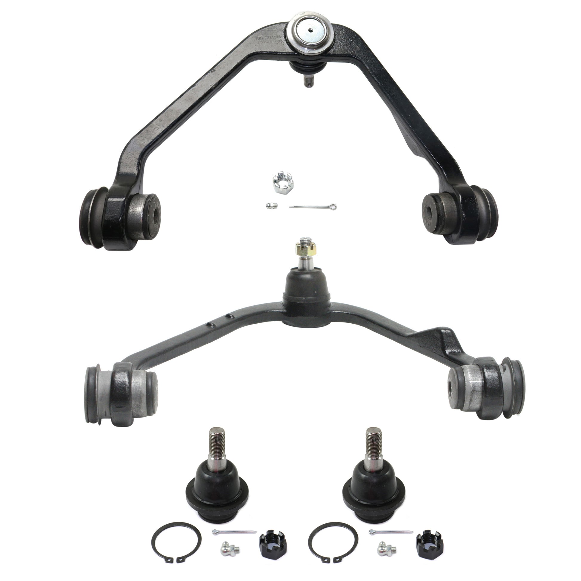 Комплект из 4 частей: передний, со стороны водителя и пассажира, комплект верхних рычагов подвески, включает (2) шаровых шарнира и (2) рычага подвески